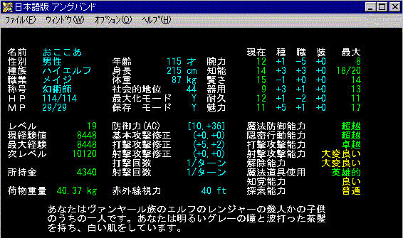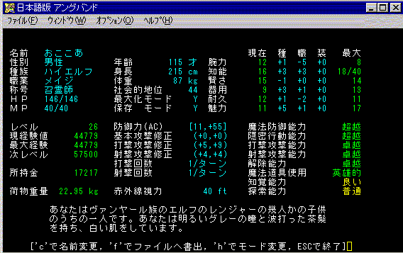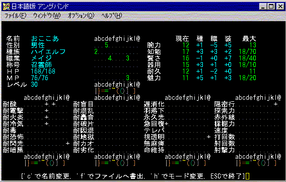 家の中にあるアイテムも、充実してきたかなあ?指輪もいろんな種類が揃ってきて嬉しい。武器も、コレクションとして「デーモンスレイヤー」シリーズは2つほどある。そうそう、嬉しいのが「賢さのアミュレット(+4)」を手に入れたこと!おここあ、結構賢くなりました。にんまり。 レベル30になって、「抹殺」の呪文を覚えたんだけど、これはまだ未経験なの。次に地下に潜った時に使ってみようっと。現在のおここあの状態はこんな感じ。↓