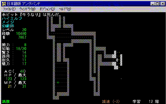 12Fを探索中、青色の「h」モンスターを発見。あれ?もしかして・・・「牛うなり」だ! くそぉぉ。負けないぞ!一か八かのファイア・ボルト。効いた!牛うなりのダメージが大きい。 これなら勝てる。あとはマジックミサイルの連打。とうとう牛うなりを倒した。感動!