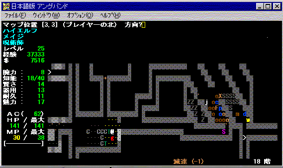 おいおい、モンスター強くないかい?おここあは結構必死で闘って、もうだめだ〜ってところで何とか倒せた・・・ってのを繰り返しているよ。 アイテムも素敵なものを拾えないまま、フロアの半分以上探検してしまった。 突然現れた「X」アンバーハルクだ! 悪戦苦闘しているうちに、レベルがやっと25になりました。嬉しい!!スピードの呪文を覚えました。どんなときに使うのかな。 |