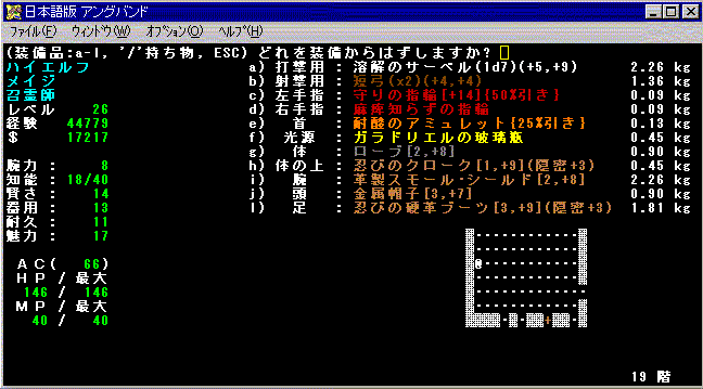 [ キャラクタの装備 ]---------------------------------------- a) シミター『ハラデッケト』(2d5)(+9,+11)(攻撃+2) b) 高速度の長弓(x3)(+7,+15) c) ダメージの指輪(+12) d) 精度の指輪(+16) e) 賢さのアミュレット(+5) f) ガラドリエルの玻璃瓶 g) 革製スケイル・メイル『サルケットス』(-1)[11,+25](+3) h) 守りのクローク[1,+14] i) 耐電の金属製ラージ・シールド[5,+8] j) センゲル王の金属帽子[3,+11](+3) k) (なし) l) 忍びの硬革ブーツ[3,+4](隠密+3) ------------------------------------------------------------ ※ 紫色の文字がアーティファクトだよ。 さて、これでどんなふうに闘えるのか、ちょっと地下に潜って試してみよう。降りてみると「なんて退屈なところだ」だった。ガックリ。せめてもうちょっと良い雰囲気に降りたかったなあ。 |