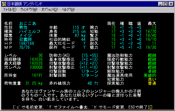 フェイズ・ドアで逃げながらやっとアンガマイテを殺した。さて、と装備を見たときびっくり!! なんと、装備しているアイテムのことを忘れている!「耐酸のアミュレット」はタダのアミュレットになっているし、耐冷のローブはタダのローブ。腕力の指輪(+5)も何もかも、タダのアイテムになっているのだ。ショック!!!ひとつひとつ鑑定の呪文で思い出していったよ。今日ほどおここあが魔法使いで良かったって思ったことはないわ。そうじゃないと鑑定の巻物がいくつあっても足りないじゃんっっ アンガマイテが死んだ後、いろいろアイテムを落としてくれた。ランス(2d8)(+3,+5)、滅邪のブロード・アックス(2d6)(+6,+5)、ハルベルト(3d5)(+5,+5)かな?なんかわからんが強そうじゃない?それからダガー「ナルサンク」(1d4)(+4,+6)なるものも手に入れた。名前が付いているから結構いいやつなのかしら?しかも0.54kgだから軽いよ!ただ、おここあは今、呪文を覚えられて知能も2あがる武器を持っているので当分使わないかな。 それにしても・・・このフロア、ユニークモンスターだらけなんですけど。。。最近あまり出てこないなあ、なんて思っていたらこんなにたくさん!!少なくともあと3匹はこのフロアに居そうだ。おここあ、果たして無事でいられるのか??とりあえず「ウルク=ハイの大王アゾグ」を倒さねば(ToT) |