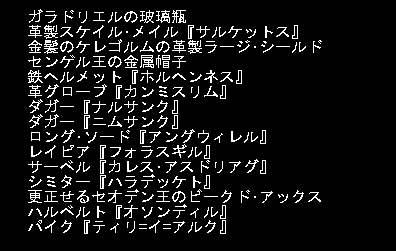 a) シミター『ハラデッケト』(2d5)(+8,+10)(攻撃+2) f) ガラドリエルの玻璃瓶 g) 革製スケイル・メイル『サルケットス』(-1)[11,+25](+3) i) 金髪のケレゴルムの革製ラージ・シールド[4,+20] j) 鉄ヘルメット『ホルヘンネス』[5,+10](+2) k) 革グローブ『カンベレグ』(+8,+8)[1,+15](+2) r) ドル=ローミンの鉄ヘルメット[5,+20](+4) j) アルヴェドゥイ王の鎖かたびら(-2)[14,+15](+2) l) イシルドゥアのフル・プレート・メイル[25,+25](+1) c) 軟革よろい『ヒスロミア』[4,+20](隠密+4) g) センゲル王の金属帽子[3,+11](+3) j) 革グローブ『カンミスリム』[1,+10] c) ダガー『ナルサンク』(1d4)(+4,+6) d) ダガー『ニムサンク』(1d4)(+4,+6) j) レイピア『フォラスギル』(1d6)(+12,+19) c) サーベル『カレス・アスドリアグ』(1d7)(+6,+8)(攻撃+1) k) ロング・ソード『アングウィレル』(2d5)(+8,+12)(+2) l) ロング・ソード『エルヴァギル』(2d5)(+2,+7)(+2) g) パイク『ティリ=イ=アルク』(2d5)(+9,+11)[+8](+2) h) 更正せるセオデン王のビークド・アックス(2d6)(+8,+10)(+3) c) ハルベルト『オソンディル』(3d5)(+6,+9)(+3) このくらいの階になると、経験値を減らしてくれちゃう嫌なモンスターが本当に多い。生命力復活の薬をまめに買っていて本当に良かった。これからも店で見つけたら買っておかなくちゃ。ユニークモンスターも現在のところ49体と出会っていて、生きているのは2体。炎の暴君『バルゴ』と不浄なる者『レン』だ。次にあった時は倒すわよ! そうそう。一つとっても悲しかったこと。それはドラゴン族の祖『グラウルング』と闘っている時だった。ヤツは古代ブルー・ドラゴンを1体召喚した。そいつを倒した時に、呪文書が出てきた。見てみるとなんと「モルデンカイネンの脱出」ではないか!やったー!!やっと手に入れたぞ!!どれどれ、どんな呪文が書いてあるのかな〜と思って読んでみると、帰還の呪文があった。へえ、これでロッドもいらなくなるんだなあ、なんて思いつつ、すっかりセーブを忘れていたワタシ。次に出てきたモンスター(もうなんだったか忘れた)にあっけなく殺され泣く泣く「保存しないで終了」・・・そう。モルデンカイネンを拾ったデータもそのまま消えてしまったのさ。 その後、探索を続けているが、呪文書は未だ現れず。嗚呼(T-T) |