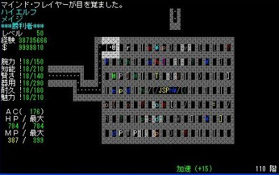 勝利者になったときのステータスを比べると、MPが上がってる!でも闘いづらいよー。ガラドリエルの玻璃瓶だから、どんな地形なのか全然分からないし、テレパシーがないので、モンスターの動きが分からない。でもこんな時もあったのよね。懐かしいわ(笑) |