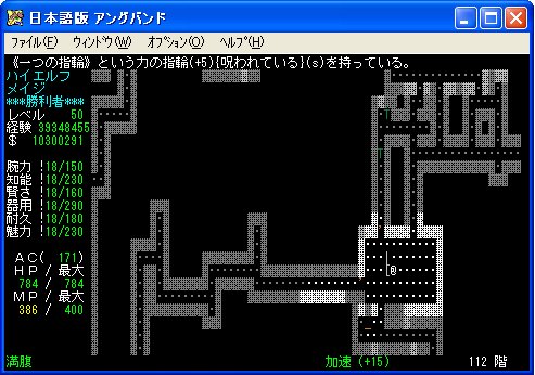 ------------------------------------------------------------------------ a) 旗手エオンウェのグレート・アックス(4d4)(+15,+18)[+8](+2) b) 長弓『ベルスロンディング』(x3)(+20,+22)(+1) c) 《ネンヤ》という力の指輪(+2) d) 《ヴィルヤ》という力の指輪(+3) e) 上級王イングウェのアミュレット(+3) f) スラインのアーケン石 g) ミスリル製鎖かたびら『ベレゲンノン』(-1)[28,+20](隠密+4) h) 灰色マント王シンゴルのクローク[1,+18](+3) i) 金髪のケレゴルムの革製ラージ・シールド[4,+19] j) ゴンドール王国の金の冠[0,+15](+3) k) 革グローブ『カンミスリム』[1,+10] l) 軟革ブーツ『ダル=イ=サリオン』[2,+13](+5) ------------------------------------------------------------------------ でもね、テレパシー能力がないと、ホントにつらい!ヘル・ワイアームやカオス・ハウンドに囲まれるといっきにHPが減ってしまう。前もってモンスターが見えて、戦いに備えられるという有り難さを実感したよ。さて、遊びはそろそろお終い。装備を変えて、更に下の階に潜ってみようと思います。 |